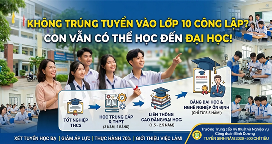 Không trúng tuyển vào lớp 10 công lập không có nghĩa là học sinh mất cơ hội học tập và phát triển. Sau khi tốt nghiệp THCS, các em có thể lựa chọn học Trung cấp để vừa học văn hóa THPT vừa học nghề, sau đó tiếp tục liên thông lên Cao đẳng hoặc Đại học. Với lộ trình khoảng hơn 5 năm, học sinh vẫn có thể sở hữu bằng Đại học và sớm tham gia thị trường lao động.
