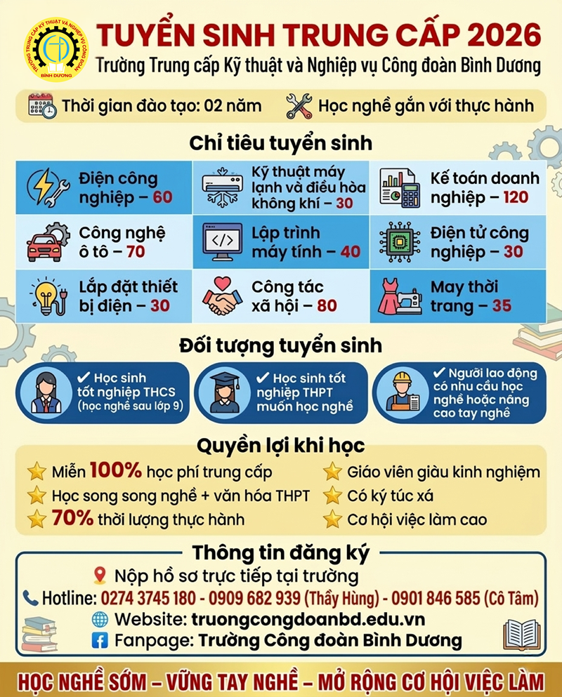 Nhằm đáp ứng nhu cầu nhân lực kỹ thuật ngày càng tăng của thị trường lao động, Trường Trung cấp Kỹ thuật và Nghiệp vụ Công đoàn Bình Dương thông báo kế hoạch tuyển sinh hệ Trung cấp năm 2026 với nhiều ngành nghề đào tạo thiết thực, phù hợp xu hướng phát triển của xã hội.