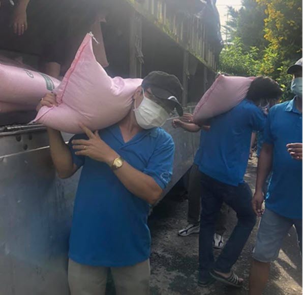 Thầy Lê Nho Lượng – Hiệu trưởng nhà trường hỗ trợ khuân vác gạo để phát cho công nhân lao động khó khăn