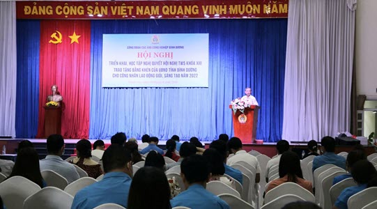 Sáng ngày 19/8/2022, Công đoàn các KCN Bình Dương đã tổ chức triển khai, học tập Nghị quyết Hội nghị lần thứ năm Ban Chấp hành Trung ương Đảng khóa XIII và trao Bằng khen của UBND tỉnh Bình Dương cho công nhân lao động giỏi, sáng tạo năm 2022.