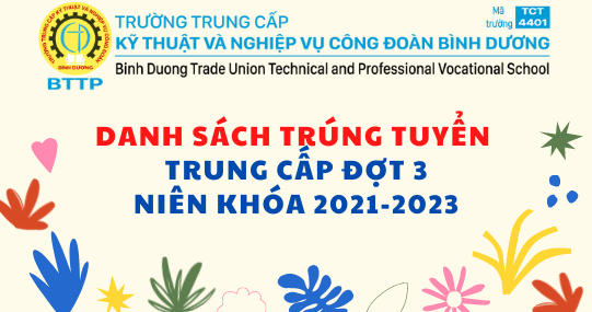 Hội đồng tuyển sinh trường Trung cấp Kỹ thuật và Nghiệp vụ Công đoàn Bình Dương (BTTP) chính thức công bố danh sách trúng tuyển trung cấp đợt 3 năm 2021 đối với các ngành, nghề đào tạo.