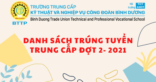 Hội đồng tuyển sinh trường Trung cấp Kỹ thuật và Nghiệp vụ Công đoàn Bình Dương (BTTP) chính thức công bố danh sách trúng tuyển trung cấp đợt 2 năm 2021 đối với các ngành, nghề đào tạo.