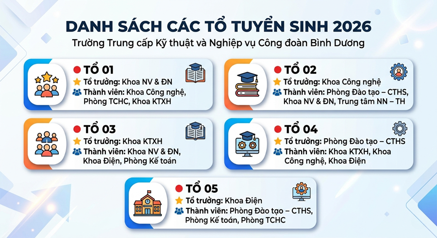 Nhằm chuẩn bị tốt cho công tác tuyển sinh năm 2026, đồng thời tăng cường hoạt động tư vấn - hướng nghiệp cho học sinh trên địa bàn, Hiệu trưởng Trường Trung cấp Kỹ thuật và Nghiệp vụ Công đoàn Bình Dương đã ban hành Quyết định số 09/QĐ-TCCĐ ngày 28/01/2026 về việc thành lập các Tổ thực hiện công tác tuyển sinh năm 2026.