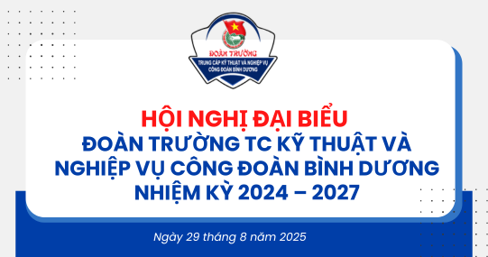 Chiều ngày 29/8/2025, tại Hội trường B3, Đoàn trường TC Kỹ thuật và Nghiệp vụ Công đoàn Bình Dương đã long trọng tổ chức Hội nghị Đại biểu Đoàn trường nhiệm kỳ 2025–2027. Đây là sự kiện chính trị quan trọng của tuổi trẻ nhà trường nhằm tổng kết, đánh giá công tác Đoàn và phong trào thanh niên nhiệm kỳ 2022–2024, đồng thời đề ra phương hướng, nhiệm vụ trong nhiệm kỳ mới.