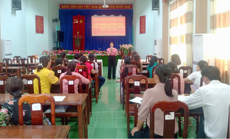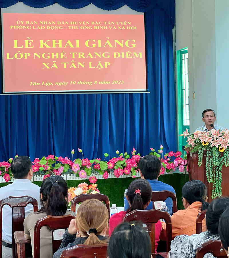 Lễ khai giảng lớp đào tạo nghề Trang điểm trình độ sơ cấp đã diễn ra thành công tại xã Tân Lập, huyện Bắc Tân Uyên, tỉnh Bình Dương vào ngày 10/8/2023. Khóa học này có thời gian kéo dài 3,5 tháng, với tổng số giờ thực học là 320 giờ và số ngày thực học là 40 ngày.