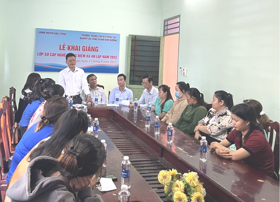 Lễ khai giảng đã diễn ra trong không khí trang trọng và phấn khởi, với sự hiện diện của Ban Giám hiệu và quý thầy cô từ Trường Trung cấp Kỹ thuật và Nghiệp vụ Công đoàn Bình Dương, Phòng Lao động - Thương binh và Xã hội huyện Dầu Tiếng, cùng với UBND xã An Lập. Các đại biểu đã gửi lời chúc thành công và khích lệ tới tất cả các học viên tham gia khóa học này.