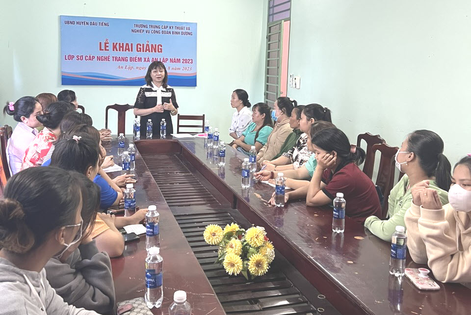 Ngày 23/8, Trường Trung cấp Kỹ thuật và Nghiệp vụ Công đoàn Bình Dương phối hợp Phòng Lao động - Thương binh và Xã hội huyện Dầu Tiếng, UBND xã An Lập đã tổ chức lễ khai giảng lớp dạy nghề Trang điểm trình độ sơ cấp 31 học viên tại xã.