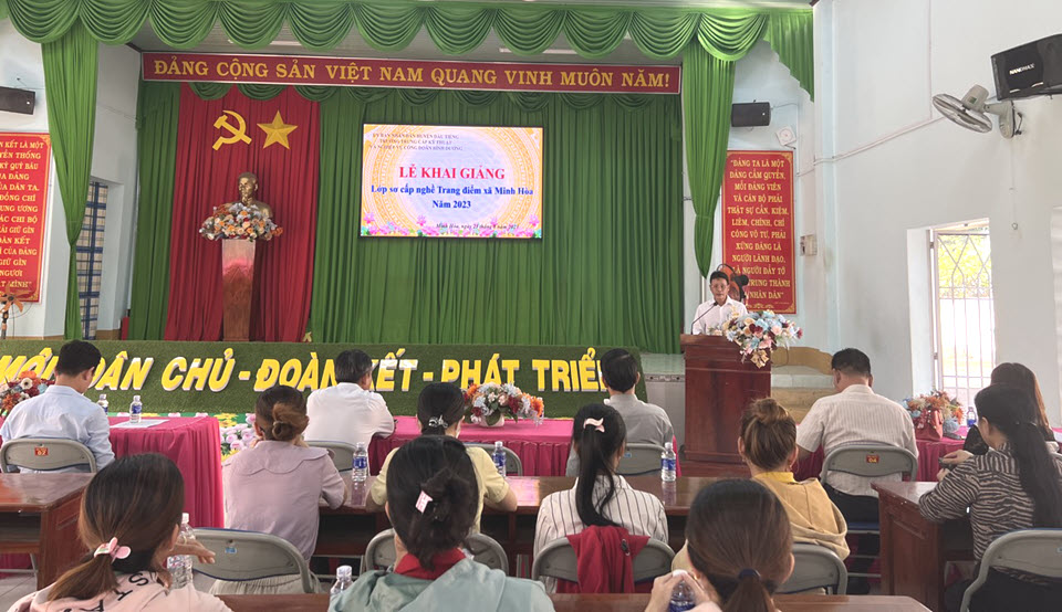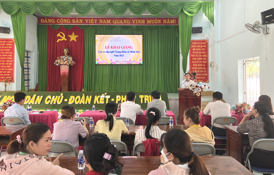 Ngày 23/8, Trường Trung cấp Kỹ thuật và Nghiệp vụ Công đoàn Bình Dương phối hợp Phòng Lao động - Thương binh và Xã hội huyện Dầu Tiếng, Hội LHPN huyện Dầu Tiếng, UBND xã Minh Hòa, Hội LHPN xã Minh Hòa đã tổ chức lễ khai giảng lớp dạy nghề Trang điểm trình độ sơ cấp cho 22 học viên tại xã Minh Hòa, huyện Dầu Tiếng.