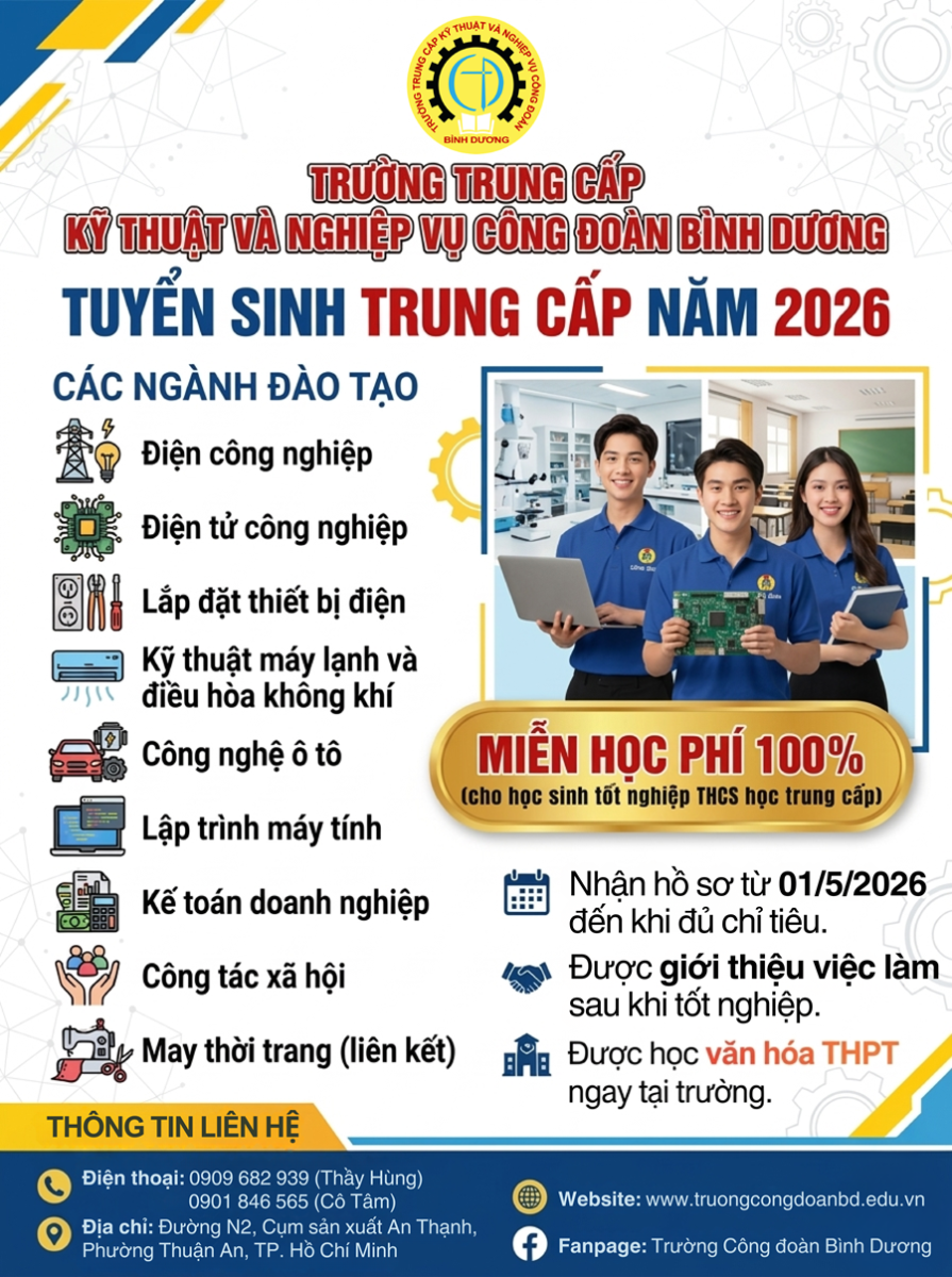Nhằm tạo thêm cơ hội học tập cho học sinh tốt nghiệp THCS, Trường Trung cấp Kỹ thuật và Nghiệp vụ Công đoàn Bình Dương thông báo tuyển sinh trung cấp sau THCS năm 2026 với nhiều chính sách hỗ trợ và quyền lợi thiết thực dành cho người học.