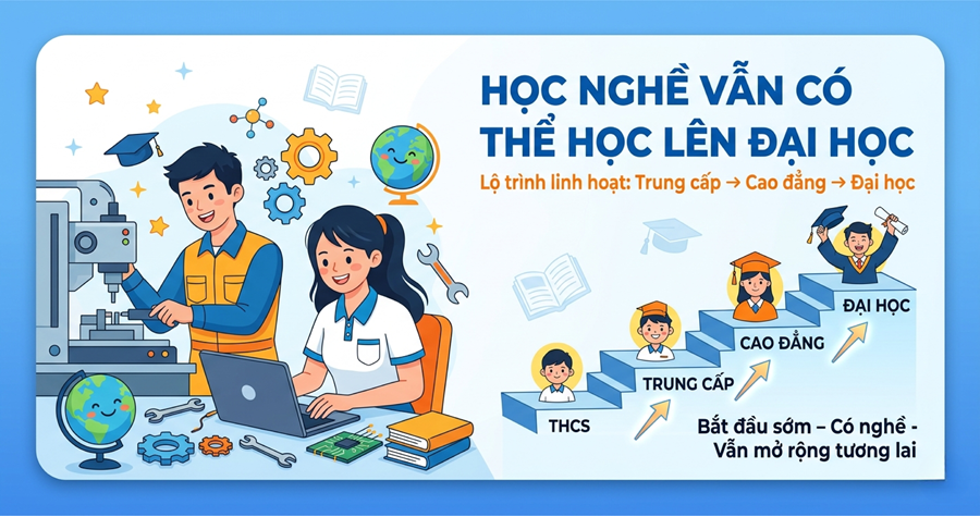 Đối với học sinh tốt nghiệp THCS, một lộ trình học tập hoàn toàn khả thi là: Trung cấp → Cao đẳng → Đại học. Đây là con đường đang được nhiều học sinh lựa chọn vì vừa có nghề sớm, vừa không giới hạn cơ hội học tập trong tương lai.
